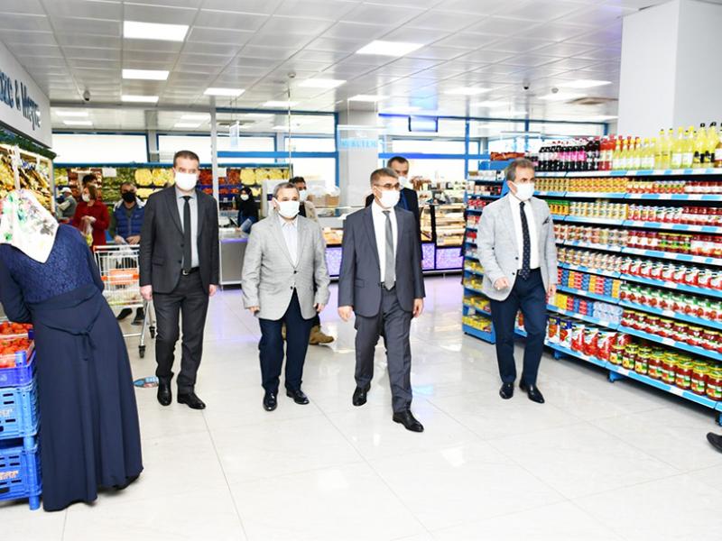 Marketlerde, hizmet alanı büyüklüğünün onda bir oranında belirlenen maksimum müşteri sayısını market girişlerine asmaları konusunda market yetkililerine uyarılarda bulunarak marketleri gezen Vali Fuat Gürel, market içinde belirlenen